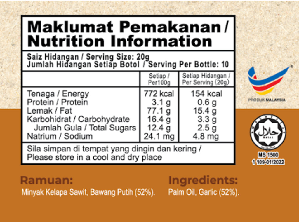 Dihasilkan daripada 200g minyak bawang putih goreng wangi, termasuk 60g bawang putih goreng sebenar yang memberi impak rasa dalam setiap titisan. Sesuai untuk mi, nasi goreng, sayur, sup dan telur!